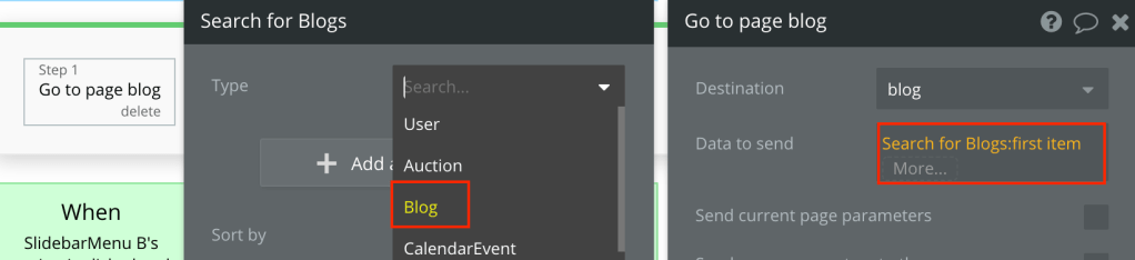 In the second solution a Search is used instead of a Custom State in the “Go to page blog” Workflow step. To assign the correct data to send in this step you’ll do a “Search for Blogs:first item” (right side of image) and then select Type to be “Blog” (left side of image). In your app you would select the relevant data type option that matches the same data type as the destination page. Note you’ll need to include “:first item” since the Search is looking for a list of things and you’re only sending one set of data to the receiving page (“Blog” data in this example).
