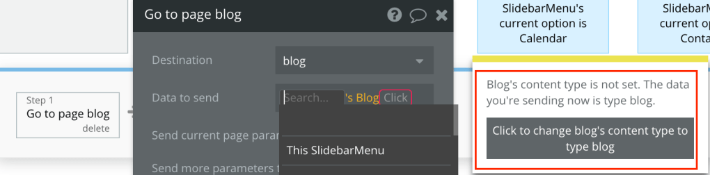 Let’s assume you’re using the SlidebarMenu to navigate between pages in your Bubble.io web app. There are two solutions in which you can setup a Workflow to go from one page with one Data Type (ie “user”) to a second page with a different Data Type (ie “blog”).