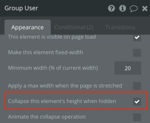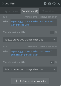 There is one Custom State called “Hidden Users” used in the Conditional to show or hide the Group. If you’re not familiar with setting up Custom States, check out https://echolaketech.com/2018/10/10/how-to-add-custom-states-to-your-bubble-app/ or watch the video at the bottom of this post.
