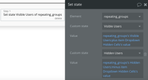 To start the Workflow to unhide any Cell (User) a Button was used. Once the button is pushed the following single-step Workflow runs. Similar to the Workflow to hide a Cell, the “Set state” Step is used to change the “Hidden Users” Custom State by removing (“:minus item”) the Dropdown’s value. And for the Repeating Group to show the Cell, the “Visible Users” Custom State needs to add (“:plus item”) the Dropdown’s value.